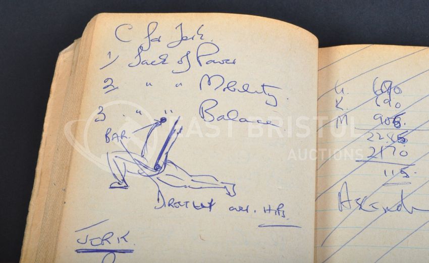 Estate of Dave Prowse - Bodybuilding - Prowse's personal Workout diary circa 1950s / 1960s. The small brown book filled in Prowse's hand with copious notes on his workouts, body building goals and achievements. The book includes several illustrations, all drawn by Prowse. The notes often make reference to Gym locations - including 'Empire', Kingswood etc. They largely list either what Prowse accomplished that day, or what he wanted to train for. Several references to World Championships / British Championships are made. A fascinating personal document from his estate which not only shows how dedicated Prowse was to his craft, but also depicts him at the very start of his career. Unique item.