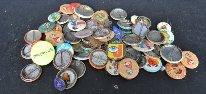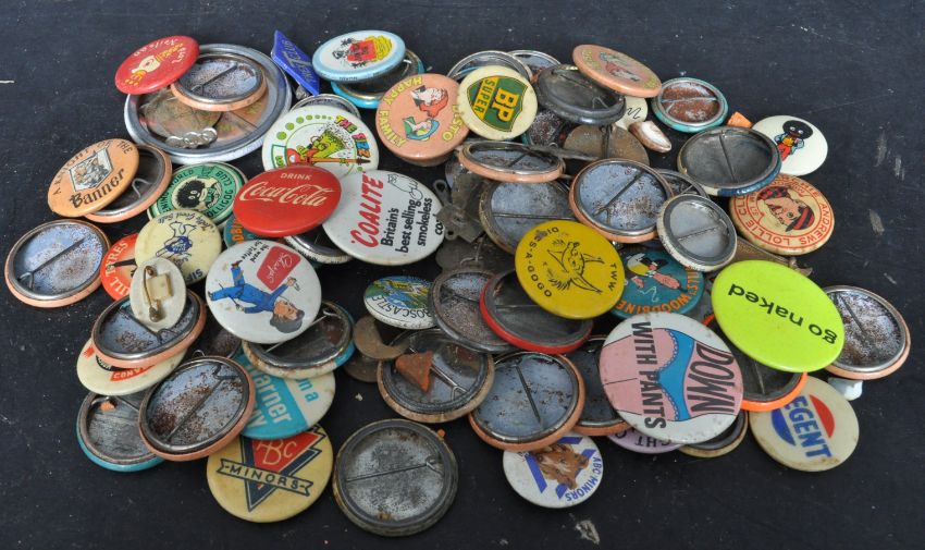 A collection of vintage 20th century badges including Jaffa, Murraymints, Coca Cola, Wills, Bisto, Down with pants, Go Naked, Down with Pants, Sifta Sam and more.