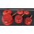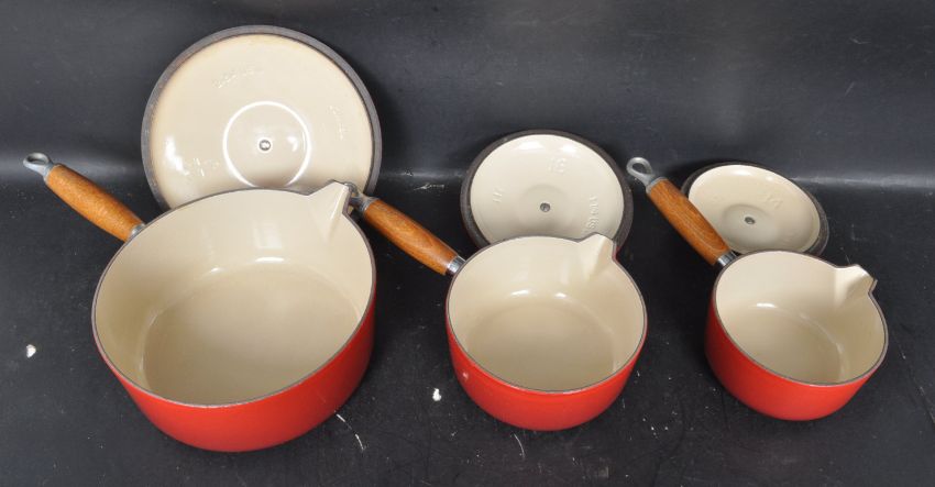 A collection of three vintage 20th century Le Creuset pans of graduating size in red enamel. Largest pan measures 30cm wide. Stamped Made in France
