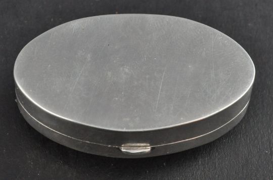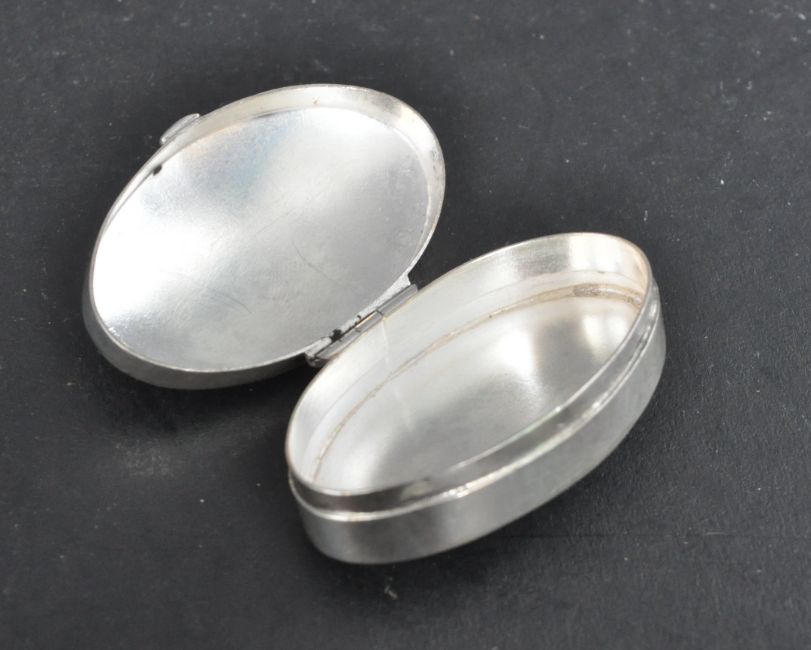 A silver pill box of oval form having a hinged lid with a domed top engraved with a floral spray to the top. Marked 925. Weight 11.4g. Measures 4cm wide.