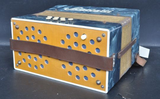 A vintage mid 20th century German made Scarlatti piano accordion having blue mother of pearl style panels with pierced metal decoration and leather strap to the sides.