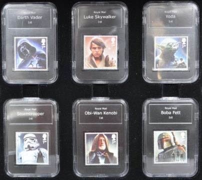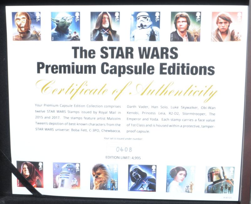 A collection of twelve Star Wars limited edition Premium Capsule Editions Royal Mail stamps comprising of Darth Vader, Luke Skywalker, Yoda, Stormtrooper, Obi Wan Kenobi & Boba Fett and more. Comes with COA. Number 408 - 4,995. Capsule measures 9cm x 5cm. Comes in its own presentation case.