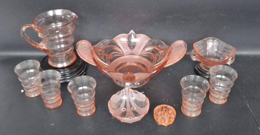 A collection of vintage retro early 20th century Art Deco orange pressed glass. The collection comprising of a lemonade set (jug and five glasses), centre piece bowl having scalloped rim, twin handle with circular foot raised on black glass circular plinth base, smaller orange pressed glass bowl having twin handles in a form of elephant head raised on a hexagonal foot and black glass circular plinth base.