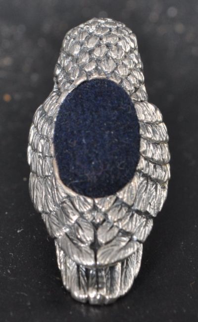 A contemporary silver pin cushion in the form of a parrot having yellow eyes and a blue velvet cushion to the back. Marked sterling to the base. Weight 13.7g. Measures 2.5cm tall.