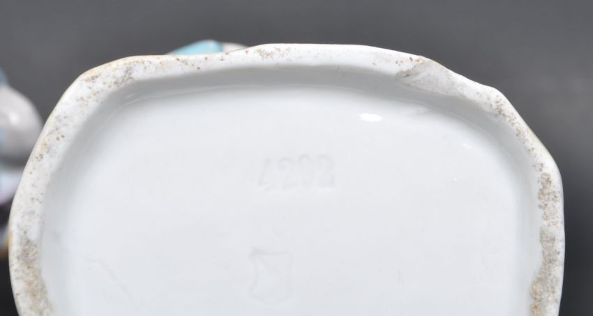 A pair of early 20th century ceramic porcelain German Ceramic match holders / table match holders. One holder depicting a boy with a dog and one with a girl with a cat. Both raised on a plinth base together with two large German ceramic porcelain figurines of a boy and girl. Measures 20cm tall.
