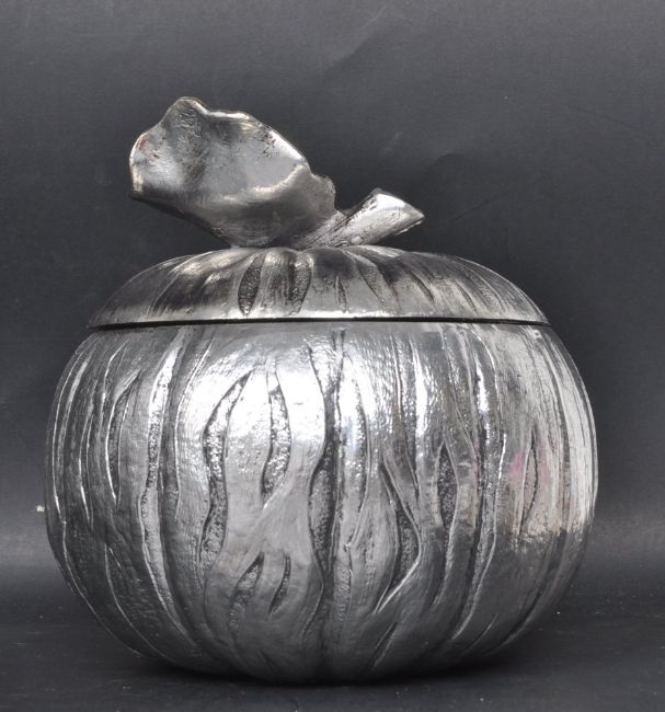 A vintage style silver plated pumpkin ice bucket by Mauro Manetti. Having a leaf to the top of the lid used as a the handle. Measures: 22cm tall. Circumference measures: 16cm.