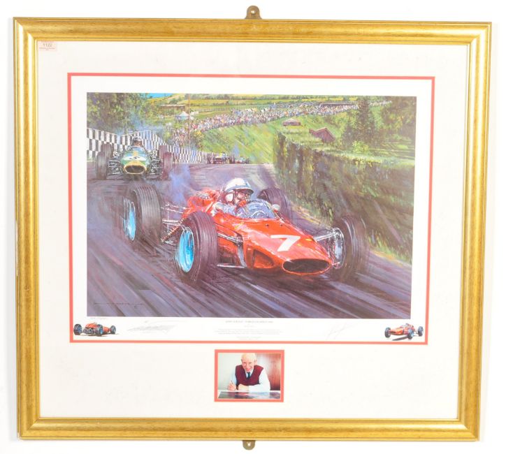 Nicholas Watts (British Contemporary) John Surtees - World Champion 1964 in the Ferrari 158 exiting the Adenau Bridge, Grosser Preis Von Deutschland, Nurburgring, 1964, colour print 304 / 500. Signed by the Artist lower left and by John Surtees Lower right. Framed and glazed.