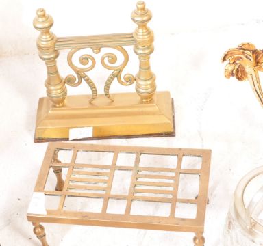 A large collection of vintage 20th century brassware comprising of candlestick shaped lamp, pestle and mortar, trivet, door stop, large bucket, copper kettle and more. Measures 68cm tall