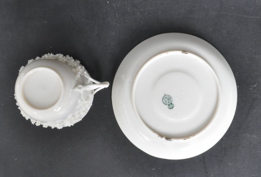 A 19th Century Victorian Royal Worcester blanc de chine tea cup and saucer having raised floral sprays with the handle moulded in the form of a vine. Green Royal Worcester stamp to the base of the saucer, marked with date letter U for 1883. Measures 8cm tall.