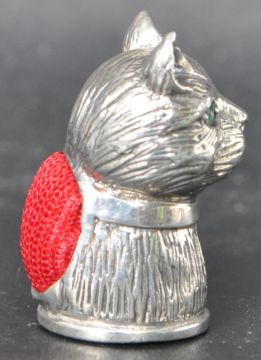 A silver pin cushion in the form of a cat having green stone set eyes and a red pin cushion to the back. Marked 925. Weight 11.3g. Measures 2.5cm.