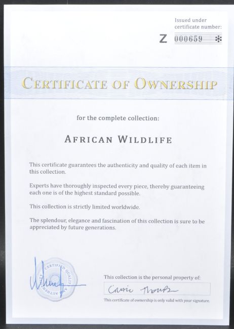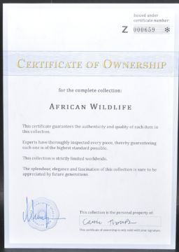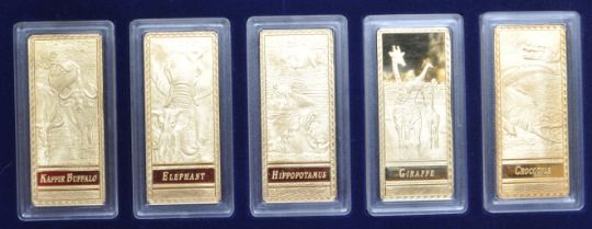 A complete African Wildlife  collection gold plated bars comprising of Kaffir Buffalo, Elephant, Hippopotamus, Giraffe,  Crocodile, Leopard, Lion, Rhino, Thompsons Gazelle & Zebra. Certificate no 000659. Bar measures 9cm by 4cm.