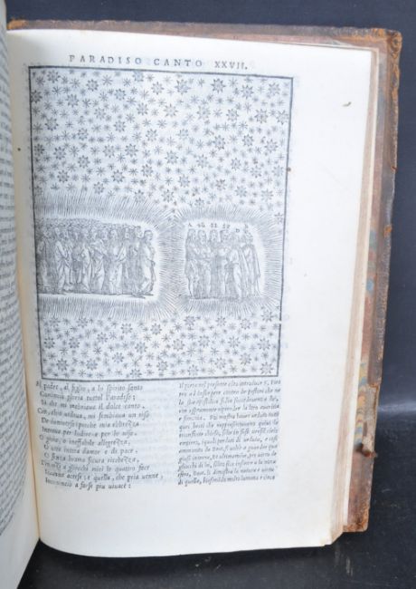 Dante Alghieri Divine Comedia - 1544 edition. A hardcover edition of the Divine Comedy. Woodcuts by Marcolini. Assessment in 1880 to the inside cover.  Buyers are advised to satisfy themselves before bidding.