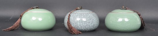 A collection of three 20th century Chinese / Oriental pottery tea caddies. The vases each with a celadon or crackle glaze and having lids with hoop and rope to the top. Measures 9cm tall.
