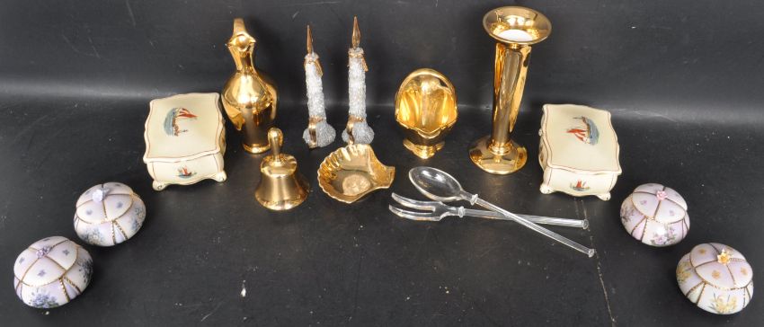 A group of vintage 20th century ceramic porcelain cabinet ware to include five Royal Winton Grimwades ceramic items, four Lena Liu’s Garden Treasures musical trinket boxes to include Violets, Asters, Daffodils, and Roses. Alongside two 1950’s Candy Box by Royal Winton.