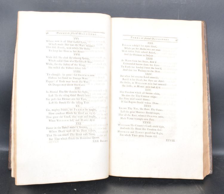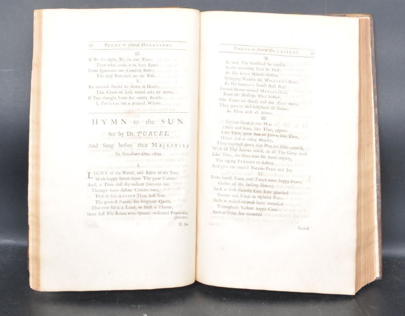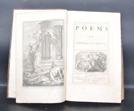 Poems on Several Occasions - Matt Prior - 1758 Printed for Jacob Tonson - An 18th Century leather bound poetry book, featuring illustrations tot he title page. Buyers are politely advised to satisfy themselves regarding the lot before bidding. Measures 48 x 30cm