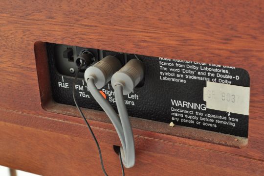 A vintage 20th century mahogany and walnut veneer Dynatron GC 1830 PW stereogram being raised on cabriole legs with wide body having stereo appointed within. Measures approx. 85cm x 101cm x 43cm