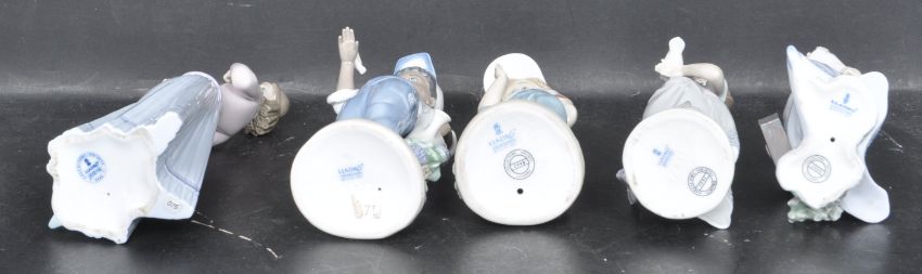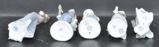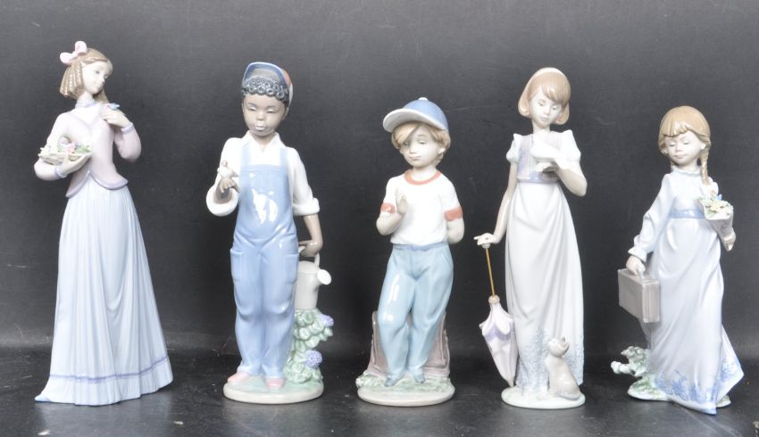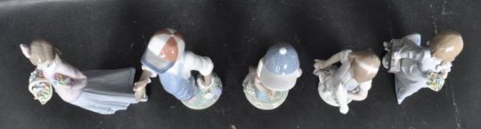 A collection of five vintage retro Spanish Lladro ceramic porcelain figurines to include: Gardening Buddies 6472, Summer Stroll 7611 ( Collectors Society 1991 ), School Days 7604 ( Collectors Society 1988 ), Can I Play 7610 ( Collectors Society 1990 ),  Innocence In Bloom ( Collectors Society 1996 ). All with makers mark to the underside