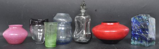 A collection of vintage mid 20th century studio art glass comprising of a Holmegaard decanter, Stuart  Strathearn / Monart vase, Vasart examples and more. measures 28cm tall.