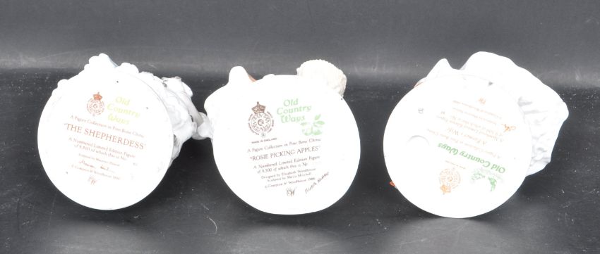 A group of three limited edition ceramic porcelain Royal Worcester Old Country Ways fine bone china figurines to include “ A Farmer’s Wife “ 61 of 9500, “ Rosie Picking Apples “ 3818 of 9500, and “ The Shepherdess “ 61 of 9500. All with makers mark to the underside.