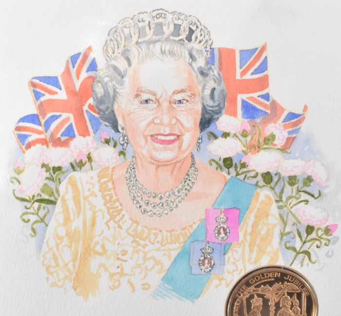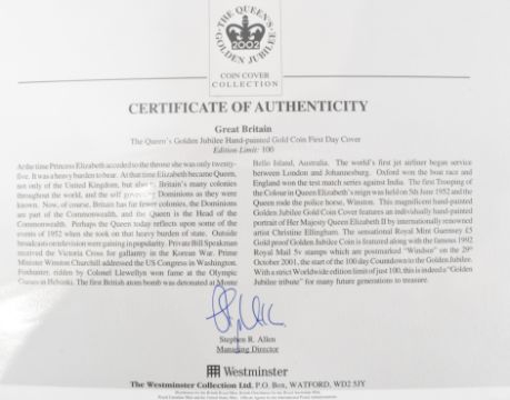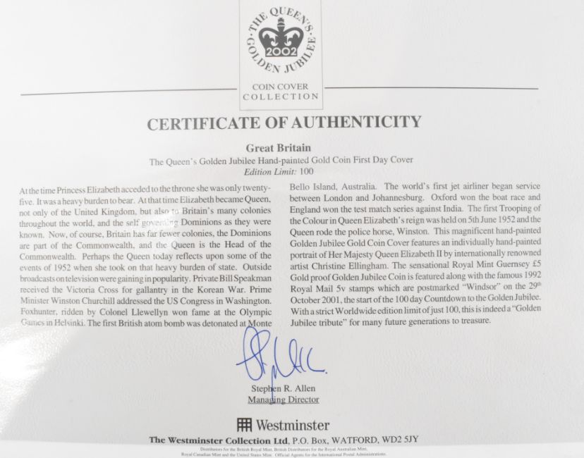 Golden Jubilee Limited Issue  £5 solid 22ct Gold Proof Coin Hand Painted First Day Cover. The cover having a portrait by Christine Ellingham. In 2002 to celebrate the queens Golden Jubilee, the Royal Mint in conjunction with Westminster released a limited issue Golden Jubilee £5 gold proof first day cover coin. Held within original blue leather presentation case. Issue 55 / 100. Measures 38.61mm diameter. Total weight 39.94g.