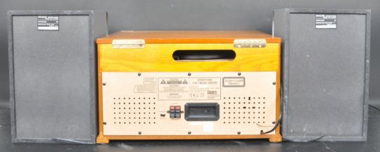 A retro style wooden hi-fi stereo system with central dial and controls with hinged top with inset record deck.