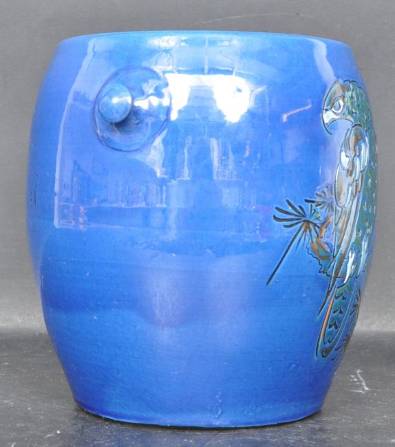 A vintage retro 20th century Charles Hubert Brannam Barnstable Ltd pottery pot / barrel of bulbous form having a bulbous body decorated with eagle to one side and W.V. 1930 to the other side. Stamped C.H. BRANNAM BRANSTABLE LTD - made in England to base.