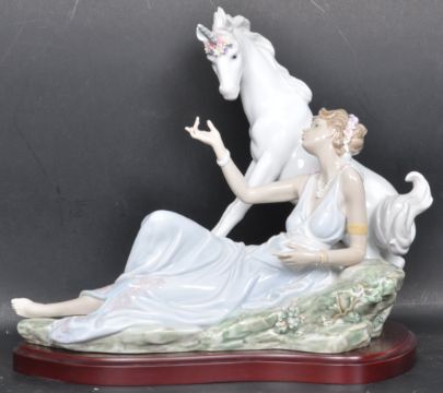 A large vintage 20th century Lladro Goddess & Unicorn porcelain figurine raised on a wooden base. 6007. Makers stamp to the underside. Measures 24cm high. Comes with original box.