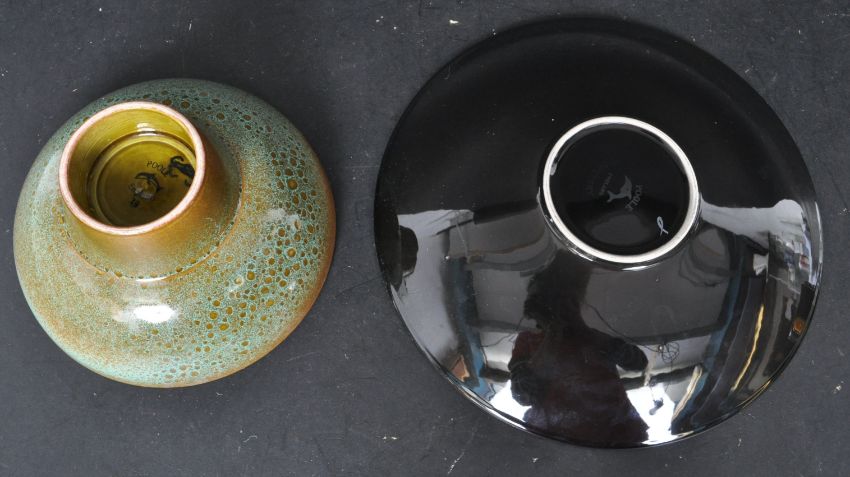 A retro vintage mid 20th century Poole Pottery Delphis pattern bowl having vibrant glazed colours together with Poole Pottery lustre dish. Makers stamp to the underside.