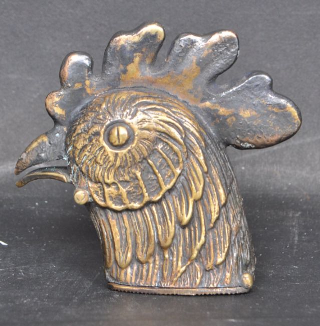 A vintage style brass vesta case in the shape of a rooster. Having a hinged base, opened by a mechanism from the beak. Measures 7cm tall.