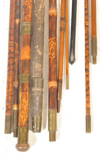 A collection of 19th century cane fishing rods of various sizes having brass and wire embellishments to the shaft. No makers mark.