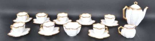 A 19th century Victorian Wileman / Early Shelley china tea service comprising of cups, saucers, milk jug and coffee pot. The service has a textured design with gilt detailing to the rim and handle . Rd150035 mark to the base.