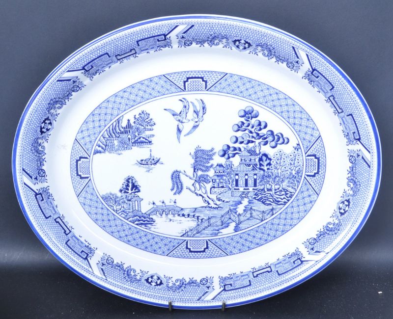 A collection of vintage 20th century Chinese / Oriental blue and white china meat platters. All having countryside scenes with geometric patterns to the border. Measures 39cm long.
