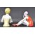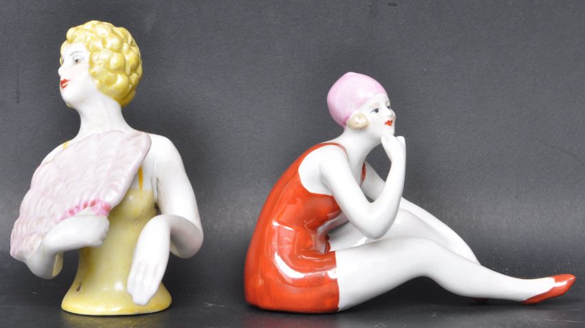 A pair of contemporary Art Deco style ceramic figures. Both wearing swimming costumes, one holding a fan and the other in a sitting pose. Tallest measures: 11cm.
