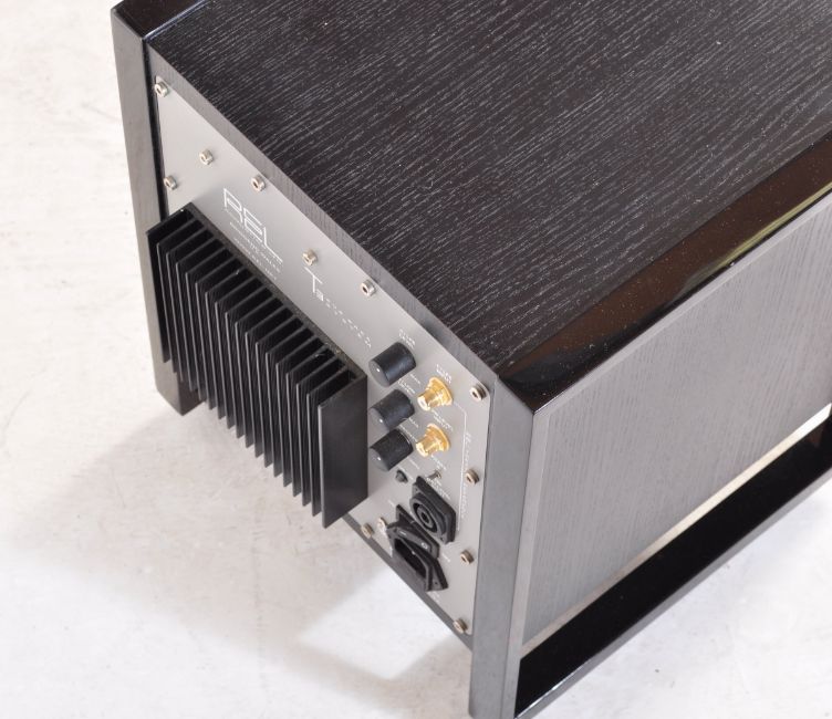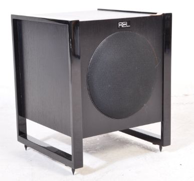 A contemporary 21st Rel T3 300w sub woofer in black ash having separate volume controls for high and low-level adjustment. The subwoofer being of cube form raised on square tubular supports.