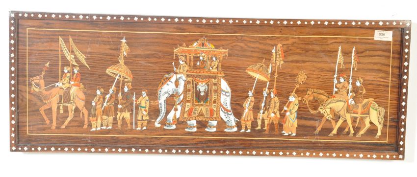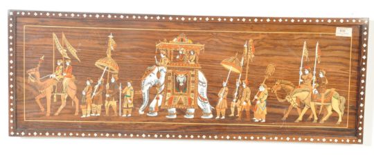 A 20th century Indian teak inlaid panel / wall hanging panel. The panel of a rectangular form inlaid with bone, glass and exotic wood depicting a people scene / ceremonial scene with elephant, horses and peoples.