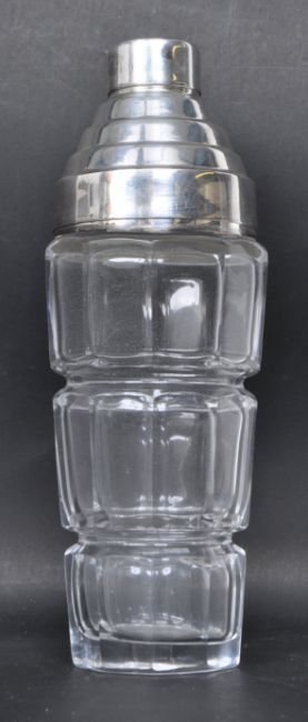 A vintage style heavy molded glass and stepped silver plated cocktail shaker. Measures 28cm tall. Good condition.