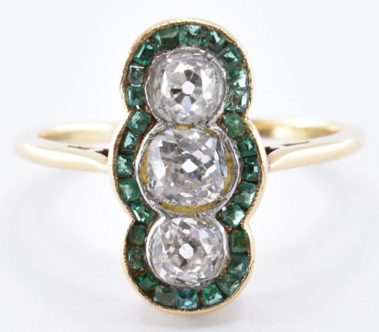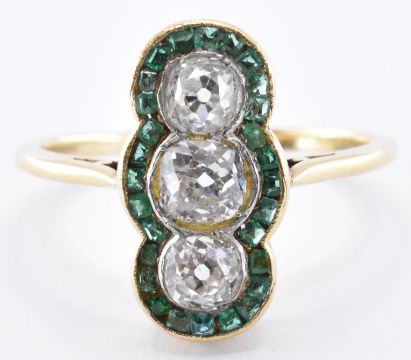 A French 18ct gold contemporary Art Deco style diamond and emerald ring. The ring being set with three round cut diamonds with a border of square cut emeralds. Rubbed mark to exterior of shank, tests indicate high carat gold. Weight 3.9g. Size S. Head measures 1.8cm. Central diamond measures 4.8 x 3mm.