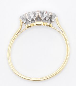 An 18ct gold and diamond three stone ring. The ring being set with three brilliant cut diamonds. Central diamond estimated 0.16ct, the secondary diamonds measure approx 2.5mm diameter. Hallmarked London 1996. Weight 2.0g. Size H.5.