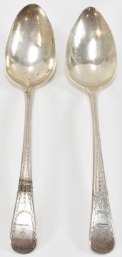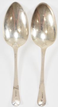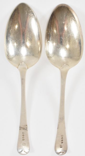 Two silver hallmarked George III table spoons, matched. Hallmarked for London, Peter & William Bateman 1807 and William Bateman 1st 1815, London. Measures 23cm in length. Total weight 124g.