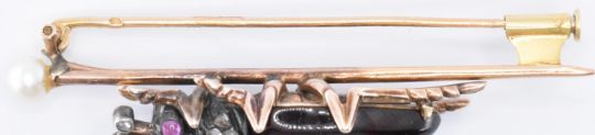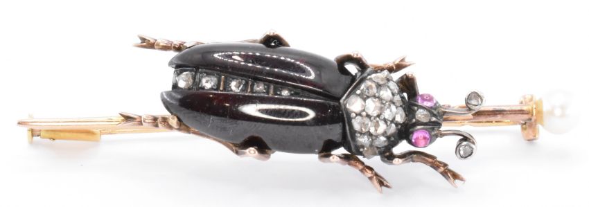 A late 19th Century French bug brooch having an 18ct gold bar brooch mounted with a beetle with a polished garnet body, ruby cabochon eyes and rose cut diamonds set throughout. The brooch having a pearl mounted to one end and hinge pin to the verso with a sliding barrel clasp. Pin marked with eagles head. Measures 6cm length. Weight 11.7g.