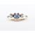 A 9ct gold synthetic sapphire and white stone ring. The ring marked 9ct to the shank with an emerald cut synthetic sapphire flanked by two white stones. Ring size N/ N.5. Total weight 1.85g.