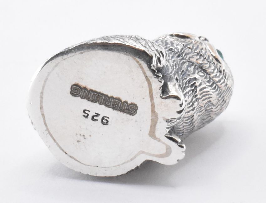 A silver cat figurine. The figure having engraved features with green stone set eyes. Marked sterling to the base. Measures 25mm tall. Total weight 11.14g.