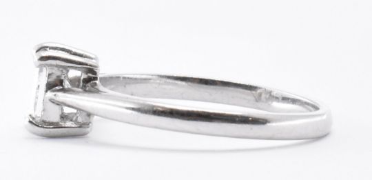 An 18ct white gold and diamond solitaire ring being set with a square princess cut diamond in a four prong setting. Diamond measures 4.5 x 5.2 x 3.4mm. Estimated diamond weight 0.65ct. Unmarked but tests indicate 18ct. Weight 3.0g. Size M.
