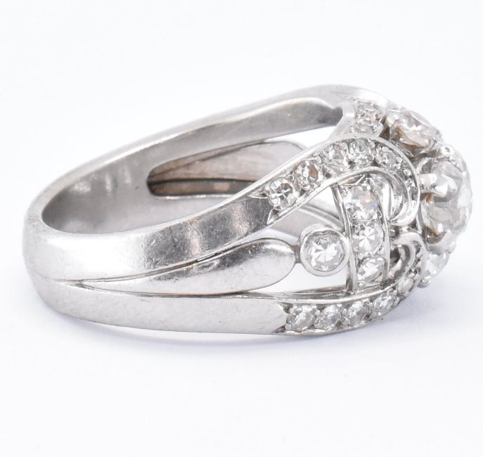A retro 1940s platinum and diamond bombe ring. The ring being set with two central round cut diamonds, with further diamonds set throughout the pierced and scrolled design head and shoulders. Central diamonds measure 4.9 x 3.7mm. Mascaron mark to the exterior of the shank. Weight 12.5g. Size Q.5.