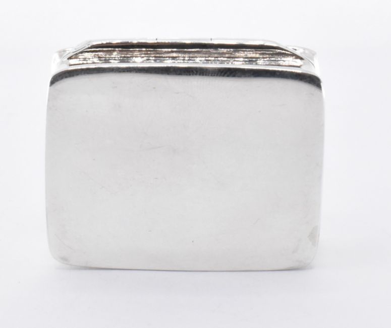 A silver and enamel lidded pill pot. The pot having an enamel panel to the lid depicting a spaniel dog. Measures 3cm x 2cm x 1cm. Total weight 16.11g.