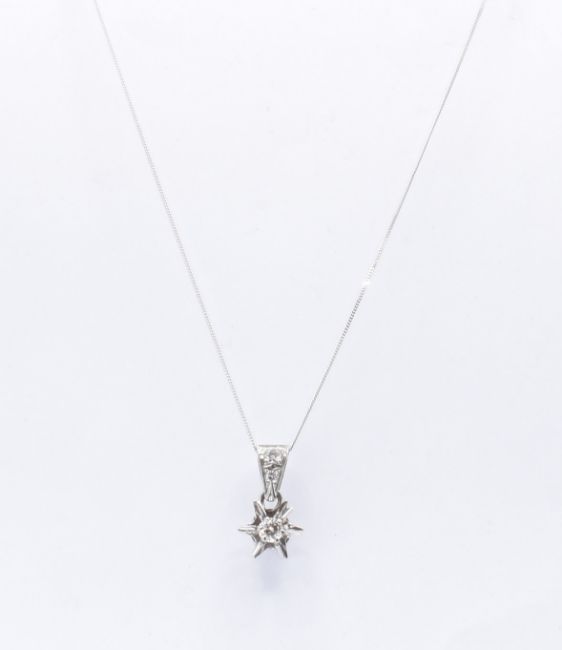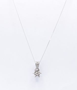 A 18ct white gold and diamond pendant necklace. The pendant having a central round cut diamond in a star setting with two further diamonds set to the bale . Principle diamond measures 3.8mm diameter. Pendant measures 1.8cm, chain measures 17 inches. Weight 3.5g.