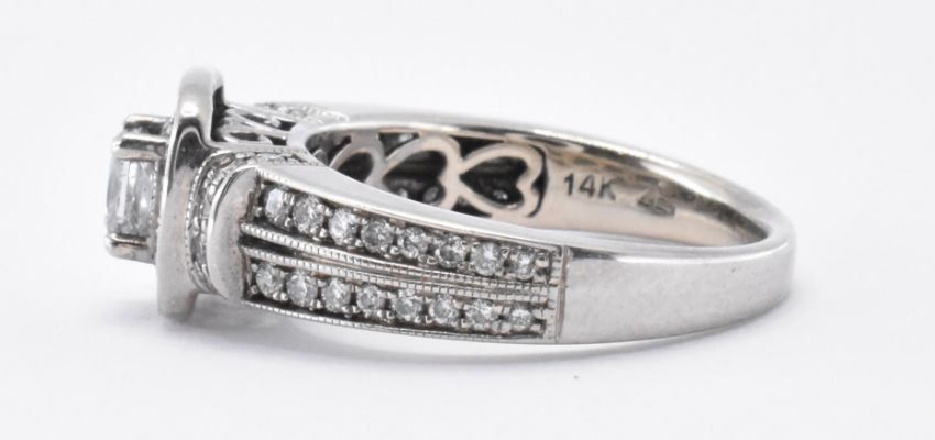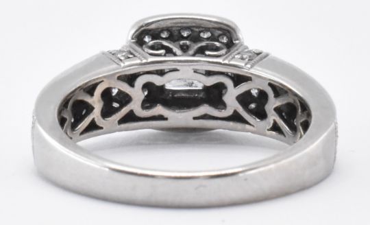 A 14ct white gold and diamond ring having a square head set with a central princess cut diamond and a halo of diamonds surrounding it, with further white stones to the shoulders. Principle stone measures 3.9 x 3.8 x 3.1mm, estimated 0.36ct. Marked 14k to the band. Weight 5.2g. Size N.5.