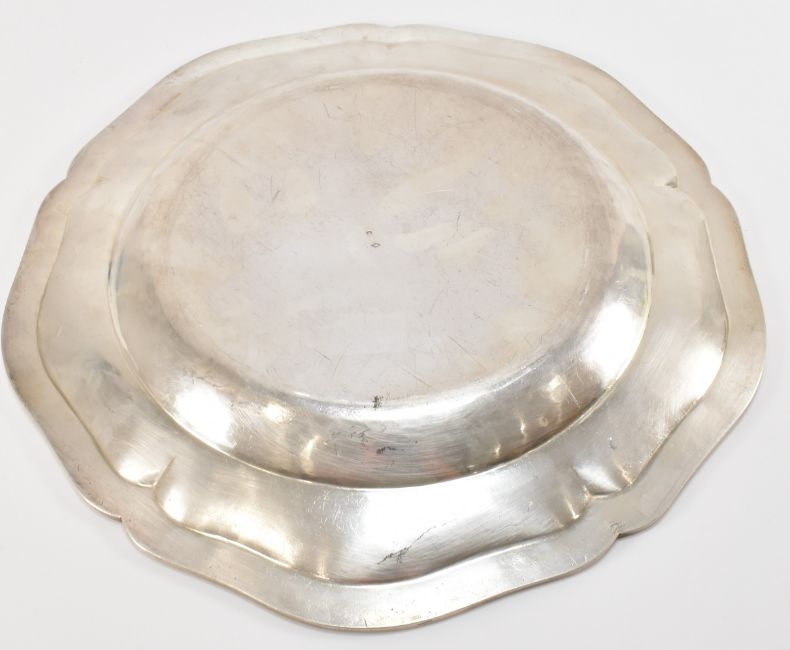 A 19th Century French silver platter / plate of round form having stepped rims. The charger being engraved with the letter T. Minerva mark to the rim and verso, makers mark rubbed. Measures 30cm wide. Weight 800g.