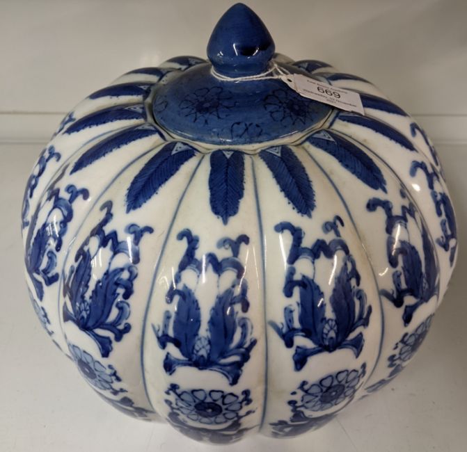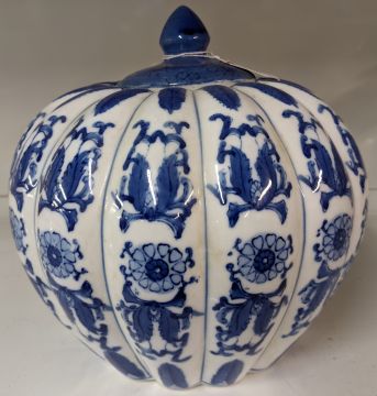 A large Chinese 20th Century ginger jar in the form of a pumpkin. Decorated with locusts and floral medallions with four character marks to base. Measures 25cm high