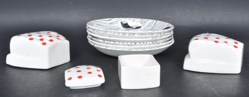 A collection of six vintage 20th century saucers by Homemade. The saucers decorated with retro items on a white black ground along with a set of Carton ware condiment set decorated with red dots. Makers mark to the underside.